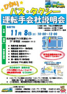光市および下松市公共職業安定所による「ひかり★バス・タクシー運転手会社説明会」が、光市で開催されます。